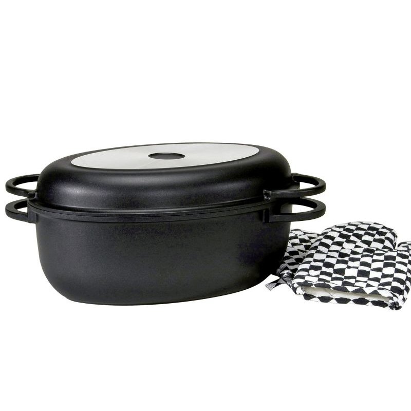 Ob Aufläufe oder Festtagsbraten – mit der Dr. Oetker MAXI-Brat- und Auflaufform gelingt jede Kreation. Dafür sorgt die besondere Quarz-Emaille-Versiegelung der Form. Dazu optimal passend hat Dr. Oetker nun einen besonderen Deckel entwickelt. Dieser Deckel ist einerseits Abdeckung, kann jedoch auch als eigene Bratform verwendet werden. Die Noppenstruktur ermöglicht ein besonders saftiges Braten, da das aufsteigende Kondenswasser nicht einfach seitlich am Deckel abläuft, sondern von den Noppen direkt auf das Bratgut tropfen kann. Die glasglatte Oberfläche ist absolut schnitt- und kratzfest, so dass der Inhalt direkt in der Form geschnitten werden kann. Die ausgezeichnete Wärmeleitung sorgt für eine rundum gleichmäßige Bräunung. Und die sehr guten Antihaft-Eigenschaften ermöglichen das leichte Lösen aus der Form.